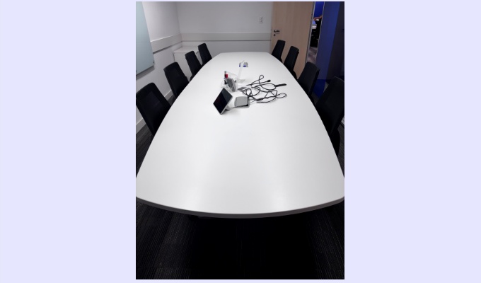 LOTE DE 01 MESA BRANCA DE 12 LUGARES DE 4,00 X 1,20 BORTOLINI E 20 CADEIRAS NA COR AZUL, COM RODIZIO, AJUSTE DE ALTURA E ENCOSTO, E APOIO DE MÃO EM 3 D (CAVALETTI)
