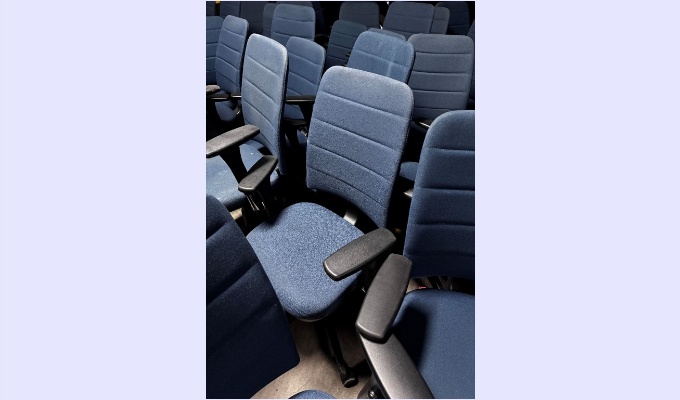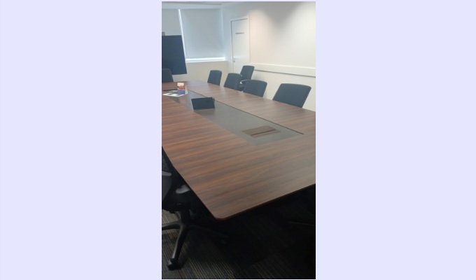 LOTE DE 01 MESA DE REUNIÃO EM MARCENARIA PARA 14 LUGARES DE 3,00 X 1,40 E 20 CADEIRAS NA COR AZUL, COM RODIZIO, AJUSTE DE ALTURA E ENCOSTO, E APOIO DE MÃO EM 3 D (CAVALETTI)